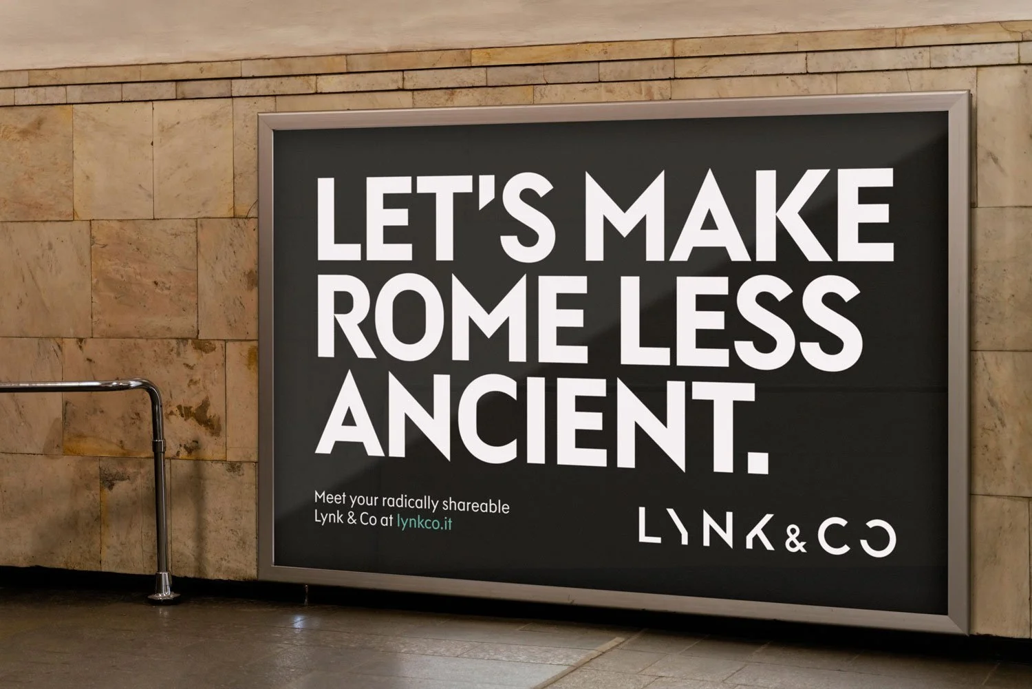 You can buy a Lynk & Co. Or borrow it. Or subscribe to it. With a one-month notice period. Also, you can share it. And there are no maintenance hassles because Lynk & Co take care of all that. In short: Lynk & Co is a lot of things —but how to explain a brand that’s so diverse and flexible on a billboard?